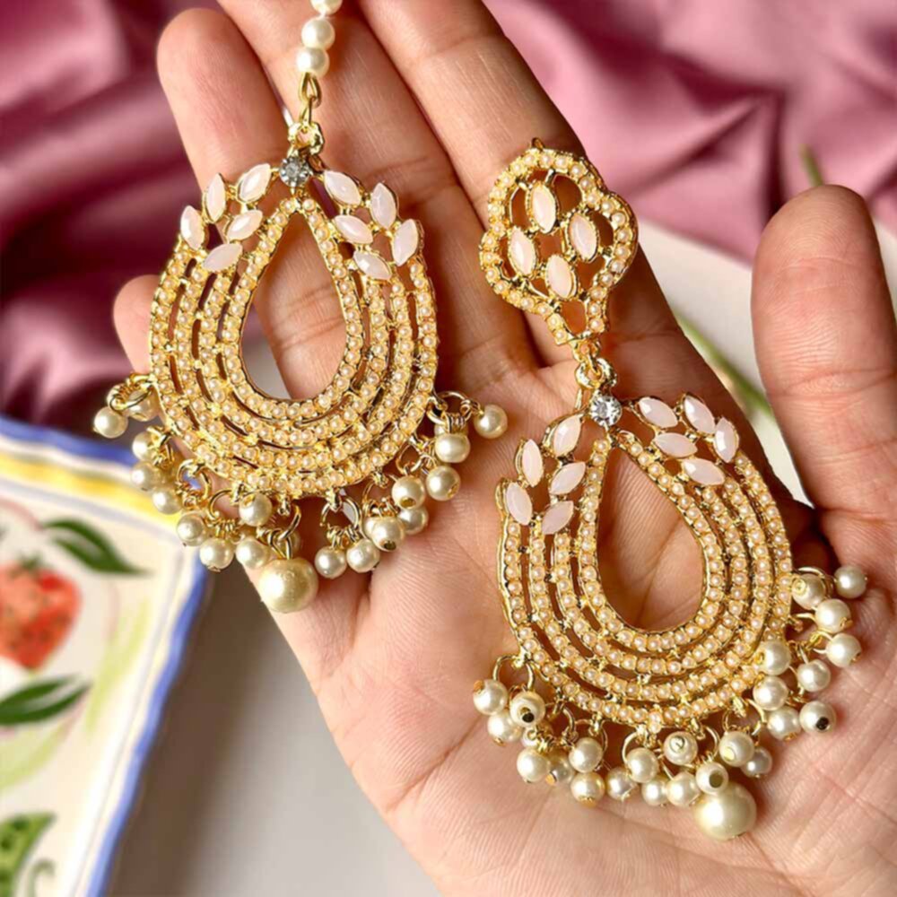 Brass based earrings and teeka set with mini bead work in unique color and pearl beads at bottom.